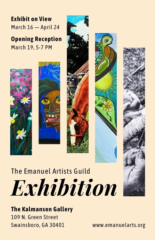 Our upcoming March '26 feature! The annual exhibition of works by members of the Emanuel Artists Guild will open with a reception on March 19th from 5 to 7pm. The reception is free and open to the public! The Kalmanson Gallery is located in the Karrh Center Building at 109 N. Green St. in Swainsboro.